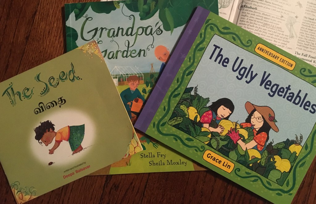 The narrator of Grace Lin’s The Ugly Vegetables helps her mother in the garden, wondering about and doubting the Chinese vegetables that her mother is planting when all the neighbours are growing flowers – until she smells the soup her mother makes from them, and everyone wants to grow and eat them too. It’s a practical, heartfelt book, giving us a window into the community – my daughter likes to identify all the children in the background – and introducing a range of vegetables with their Chinese names. I admire the mother’s confidence, her calm certainty that she can produce something delicious from the ground. I hope my vegetables grow, hope they taste good too.