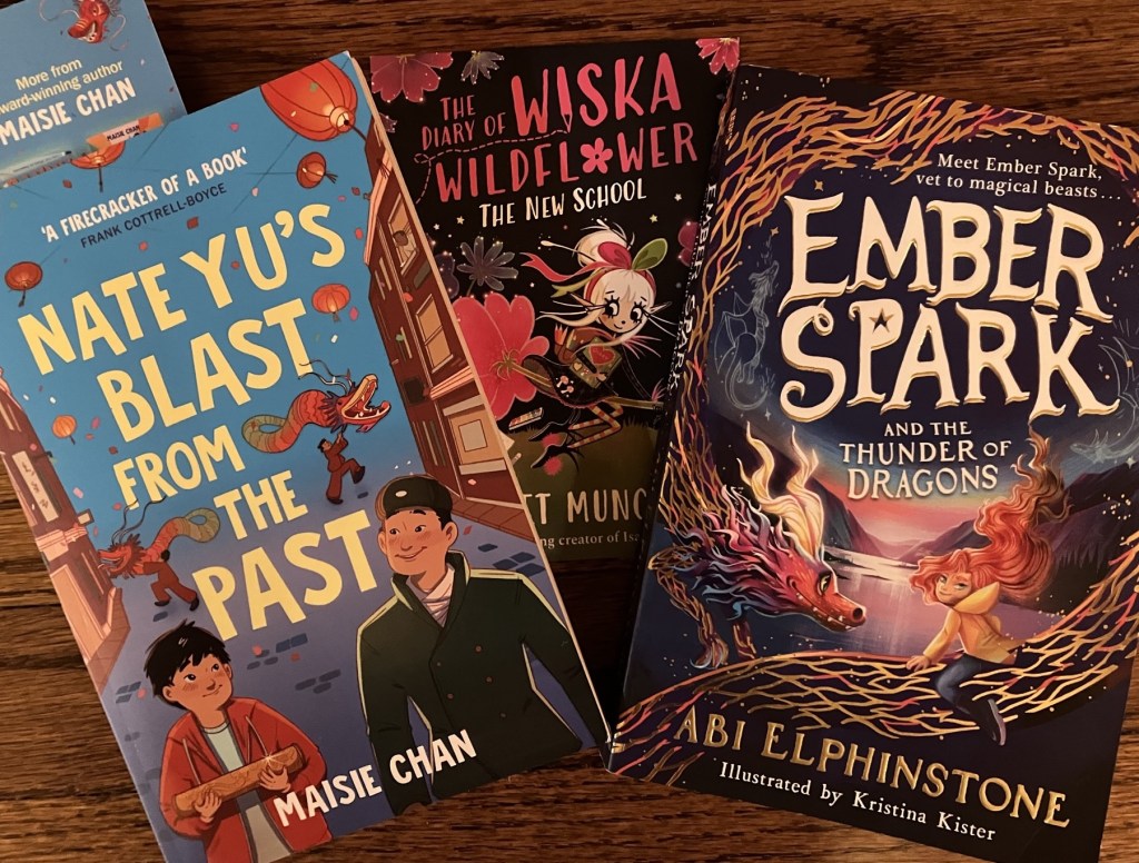 Despite years of longing, I had never been to a book festival before. My husband was speaking so I took the children to hear Daddy, and then booked tickets to some of the children’s authors. My daughter and I enjoyed ‘Reduce, Reuse, Recycle with Polly Faber’, with readings from her book Recycling Day, lots of interaction and my daughter [persuaded/permitted/forced] me to wear one of a number of very fetching hats fashioned entirely from recycled materials. My son went with my husband to hear and then meet Maisie Chan, and I hope we’ll soon be reviewing her book Nate Yu’s Blast from the Past.