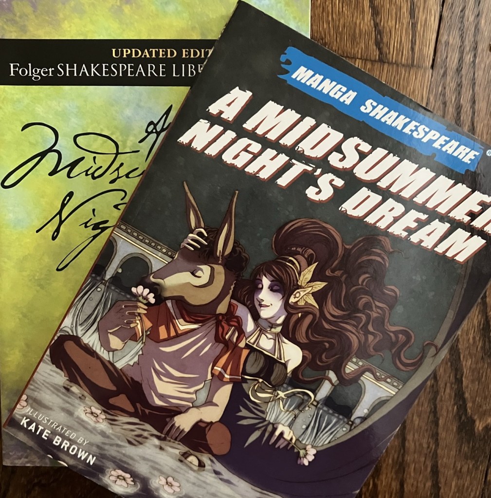 A Midsummer Night’s Dream feels like a good place to start with Shakespeare. It’s so lively and confused that I’ve found the children really enjoying the arguments and absurdities, as well as the magical setting. To familiarise him with the story, and so he could start to enjoy the language, I’d bought my son the Manga Shakespeare version (illus. by Kate Brown). He’s also a keen artist and enjoys the manga style of art; these books are graphic versions of the play with manga art illustrations, but using Shakespeare’s original language adapted by Richard Appignanesi. The story is vivid and fast-moving, but the poetry is retained. We have a few in the series and have found them an excellent introduction: https://www.mangashakespeare.com/. Other good, accessible graphic series are Classics in Graphics or No Fear Shakespeare Illustrated, and there are others, but I prefer the Manga Shakespeare because they’re an abridged version of the text, rather than just another re-telling of the story. So they introduce the language, the rhythm, the poetry, as well as the story and characters.