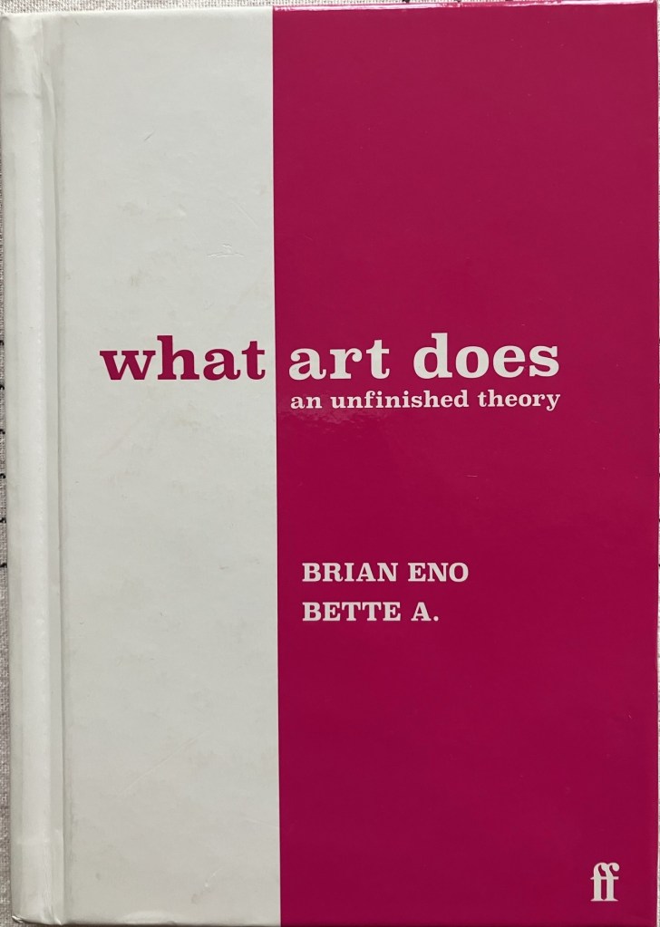 Browsing in a bookshop over the summer, my eyes were drawn to the bright pink cover of a small Faber book, what art does: an unfinished theory. It is a collaboration between electronic musician Brian Eno and artist Bette A. It has the form of a picture book—playful with fonts and layout, interspersed with sketches. It asks a simple and impossibly complex question: what does art do?